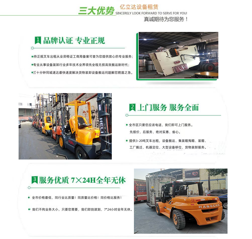 亿立达设备租赁有限公司是工商局准许的北京联合大学专业叉车出租公司,公司本着诚信、服务、效率、创新的经营理念,用精湛的技术,真诚的服务,为众多客户提供优质的服务,同时获得信赖与支持。专业提供北京联合大学3-20吨叉车出租、叉车租赁、设备搬运、集装箱掏箱装箱、机器移位定位、货物装卸、工厂搬迁、安全可靠,收费透明,价格便宜,随叫随到,24小时上门服务!本公司叉车吊车师傅对各种设备搬运装卸都有深刻探讨和研究。很多的疑难设备搬运,通过我公司的叉车师傅都能迎刃而解。对各种进口设备、国产机器、大型设备搬迁、高难度搬迁、各种精密仪器、医疗设备、科研设备等都能搬运; 提供全市 24 小时上门装卸搬运服务。同时提供厂房搬迁服务。 ...